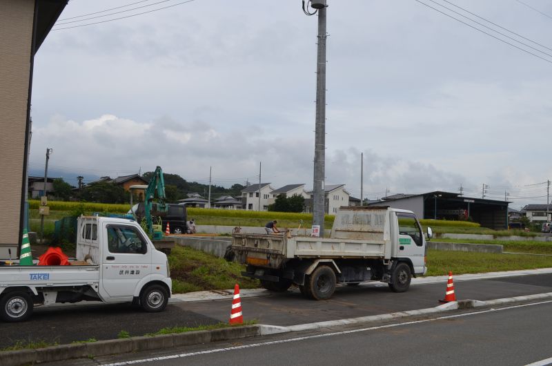 建築現場では基礎工事前のレベル出しと地縄張りが進められています。