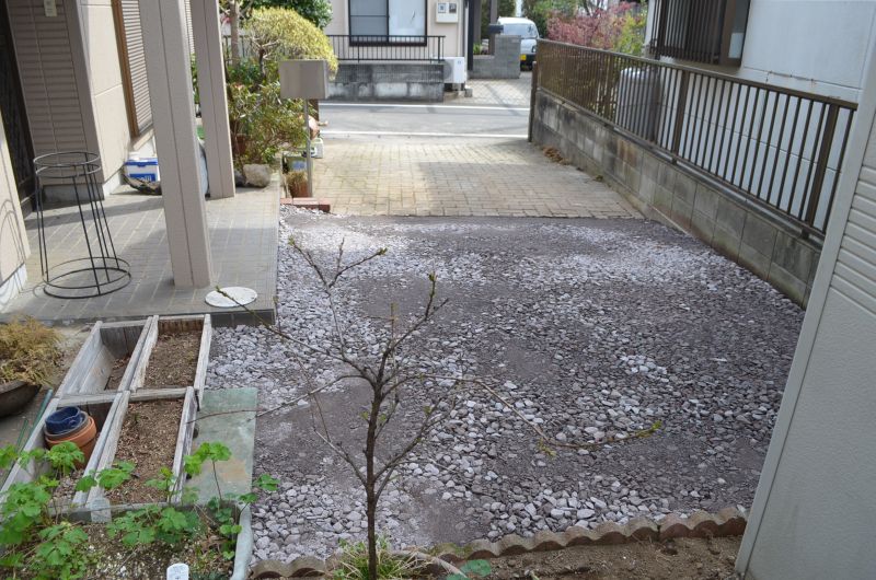 今まで植木があった部分は砕石を敷き詰めました。 これで2台分の駐車スペースが確保されました。