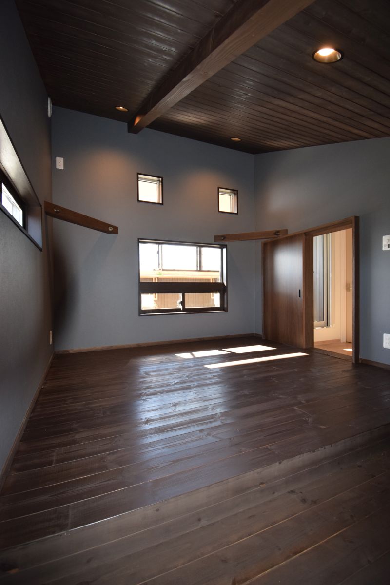 勾配天井だっった部屋に杉板を貼り平の天井に仕上げました。