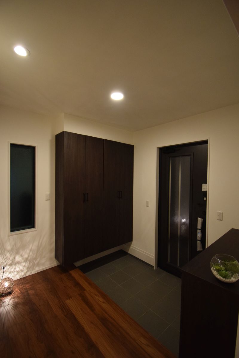 玄関ホール正面にはアクセントで外壁と同じ材料が貼られました。