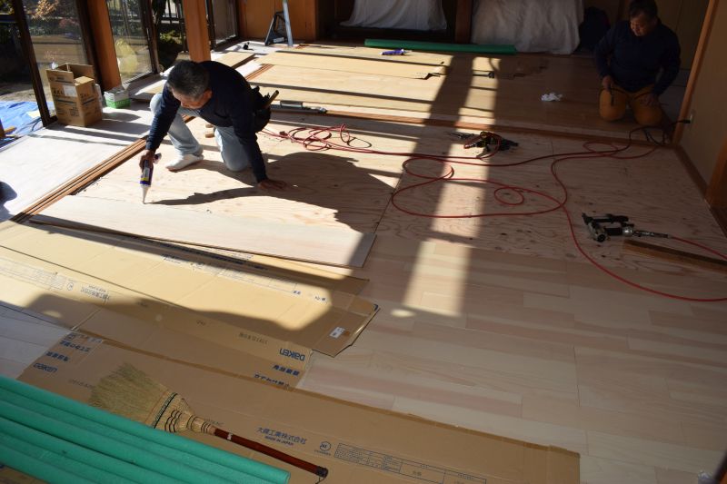 24mmの下地合板を貼り、その上に仕上げの床材を貼ります。 ※床材:大建工業(日本の樹)
