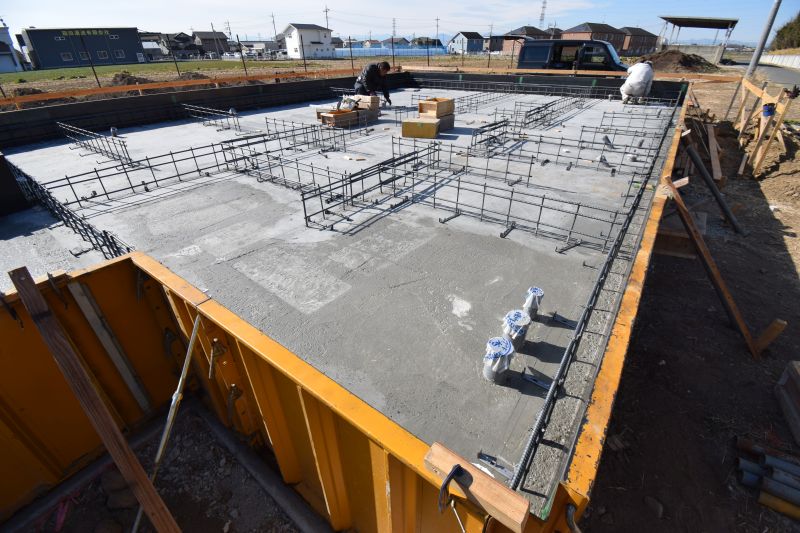 布基礎となる枠板の中に生コンが打設されました。 しばらくはコントリートが硬化するまで養生期間となります。