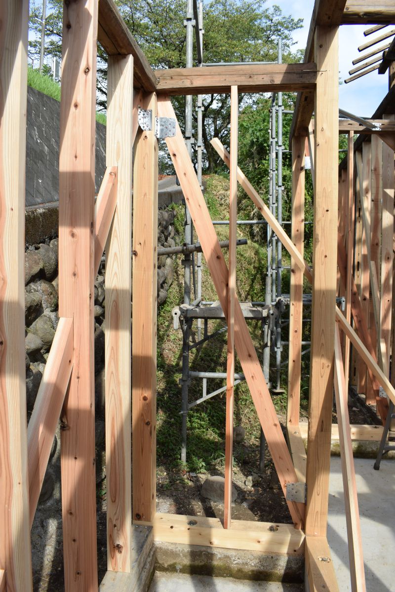 状態の悪い土台や柱は新しい物に入れ替え、さらに筋交いを入れます。