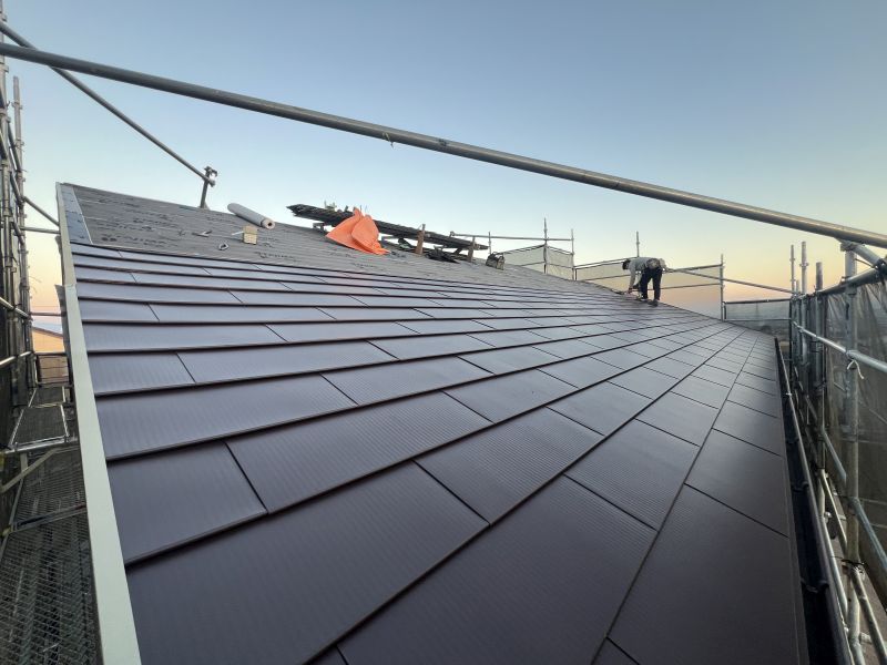 既存の屋根の上に鋼板材を葺いてゆきます。