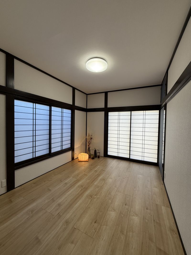 after:畳からフローリングに。 柱や鴨居は塗装して壁と天井はクロス仕上です。 内障子は和紙から丈夫なワーロンシートに貼り換えました。