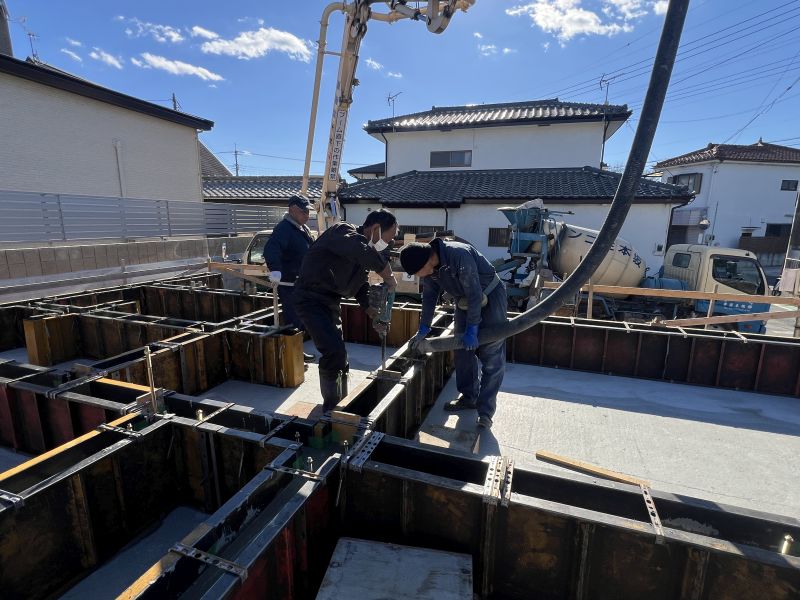 立ち上がりの布基礎部分に生コンを打設してゆきます。