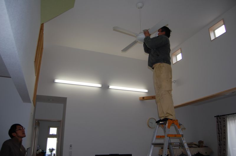 吹き抜けの天井に設置されたシーリングファン(羽)のホコリを掃除。