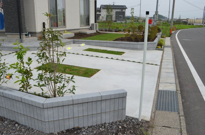 駐車エリアは芝生とリュウのヒゲが自然のアクセントを引き出しています。