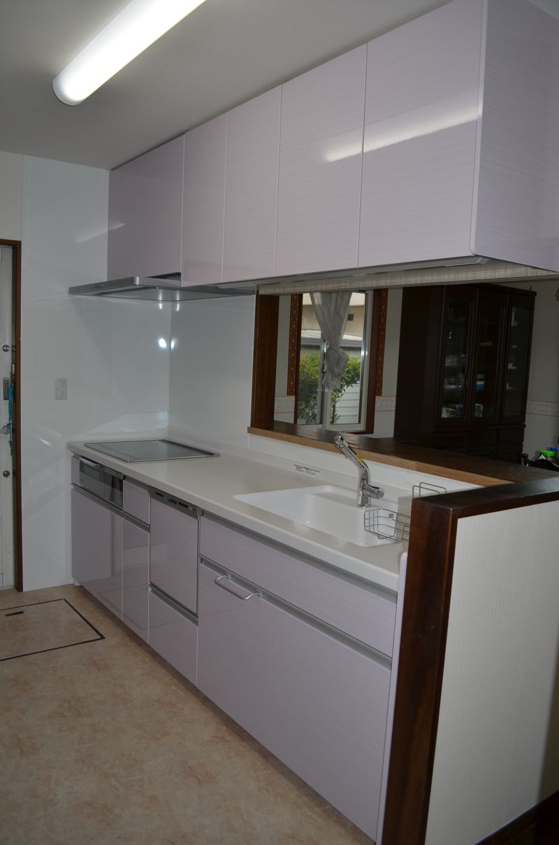 After:淡いピンク色のキッチンに大変身です。(*^_^*)