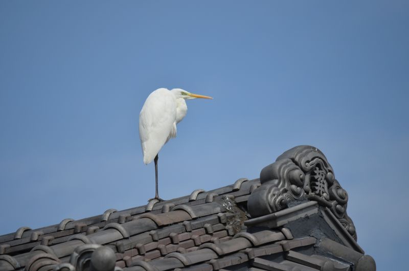 工事途中に気付いたのですが、お施主様宅の屋根に一羽の白鷺が一本足で